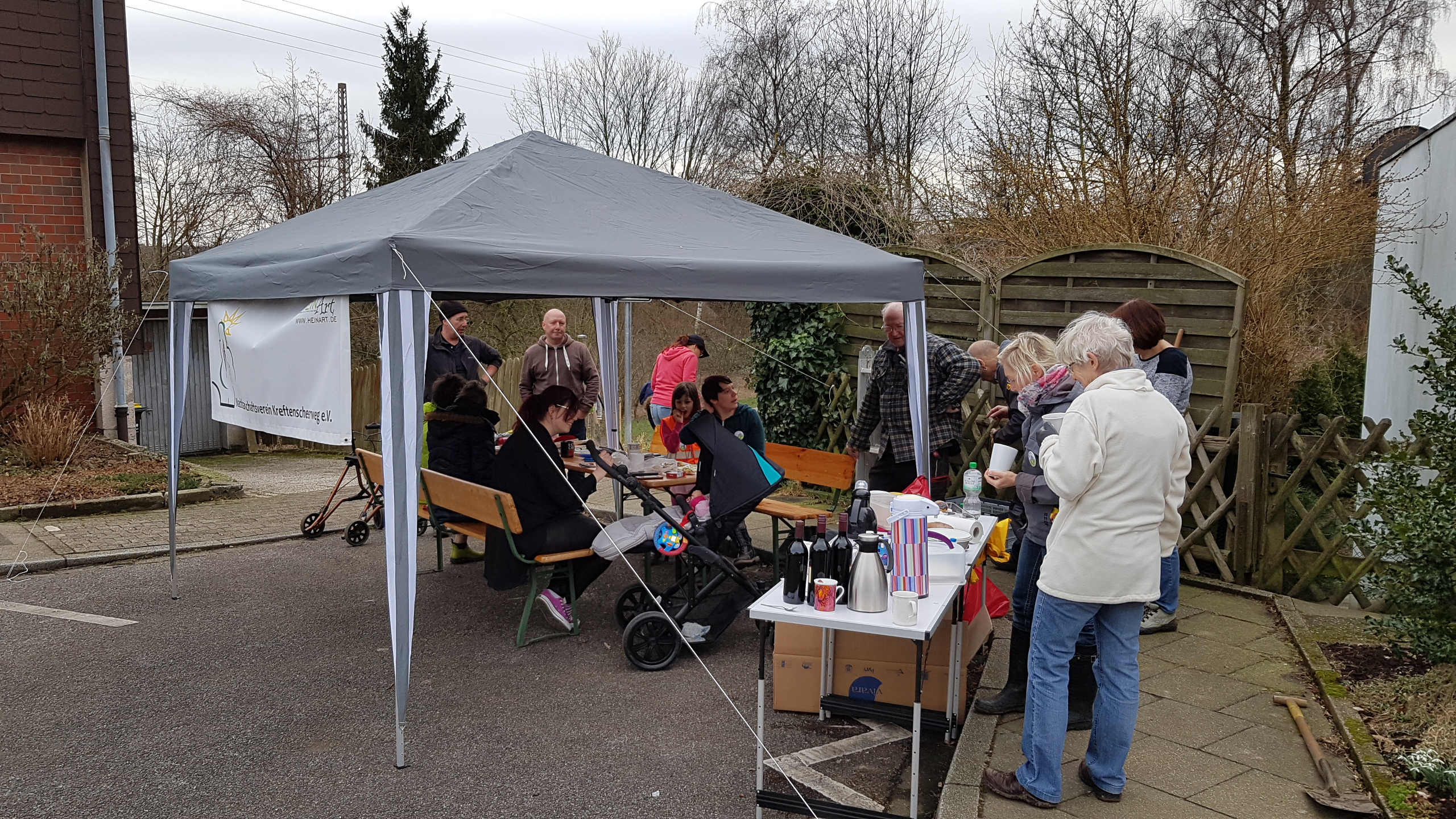 Als besondere Geste haben wir empfunden, dass auch die älteren Nachbarn uns durch ihren Besuch unterstützt und ihre Freude an unseren Aktivitäten zum Ausdruck gebracht haben. Bei Kaffee, Plätzchen und Kuchen gab es am vereinseigenen Pavillon ausreichend Gelegenheit für einen nachbarschaftlichen Austausch und Informationen rund um unsere kleine Grünfläche.